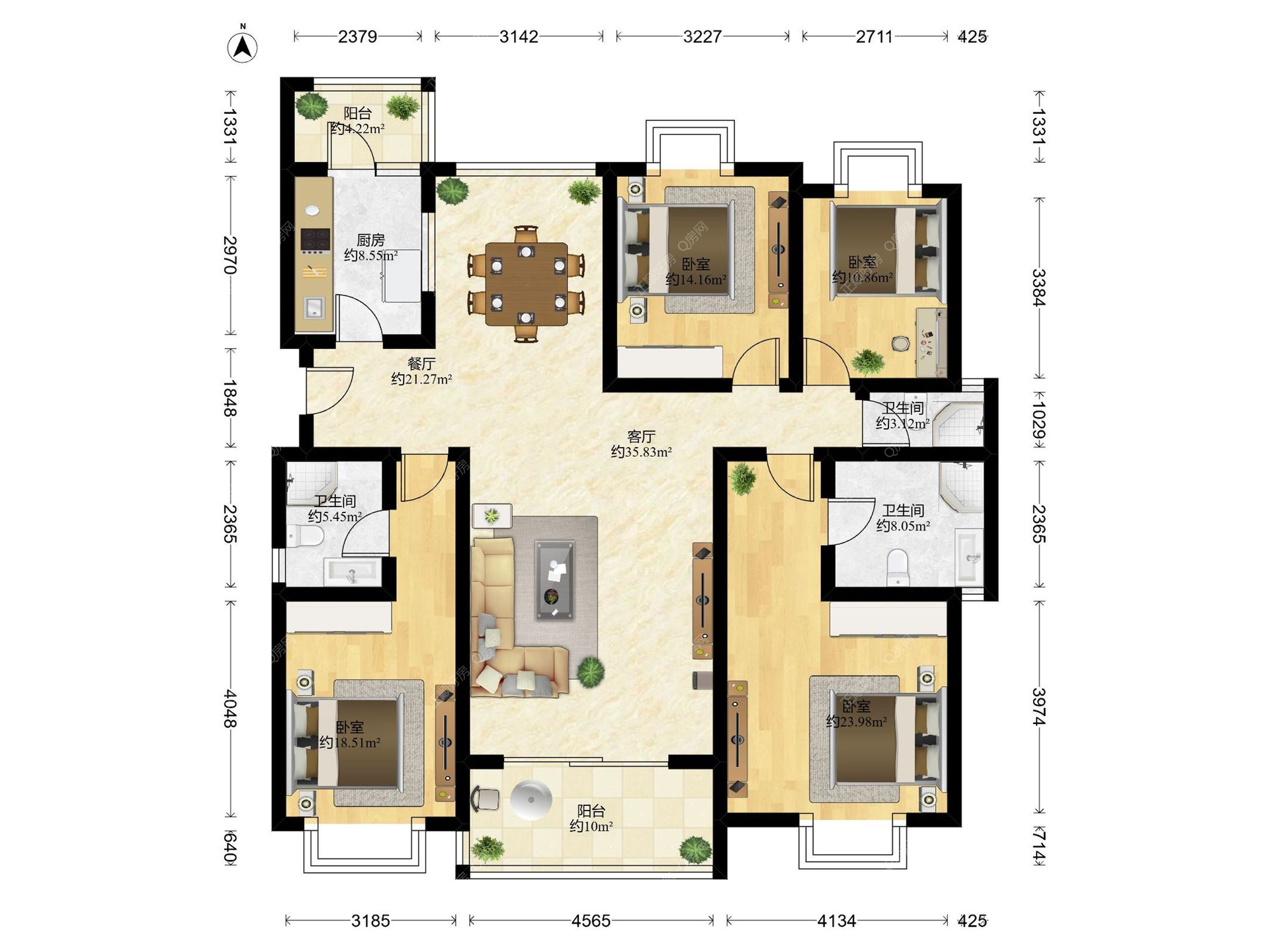 3. 此房源四房 两厅两卫 双阳台 适合住家
